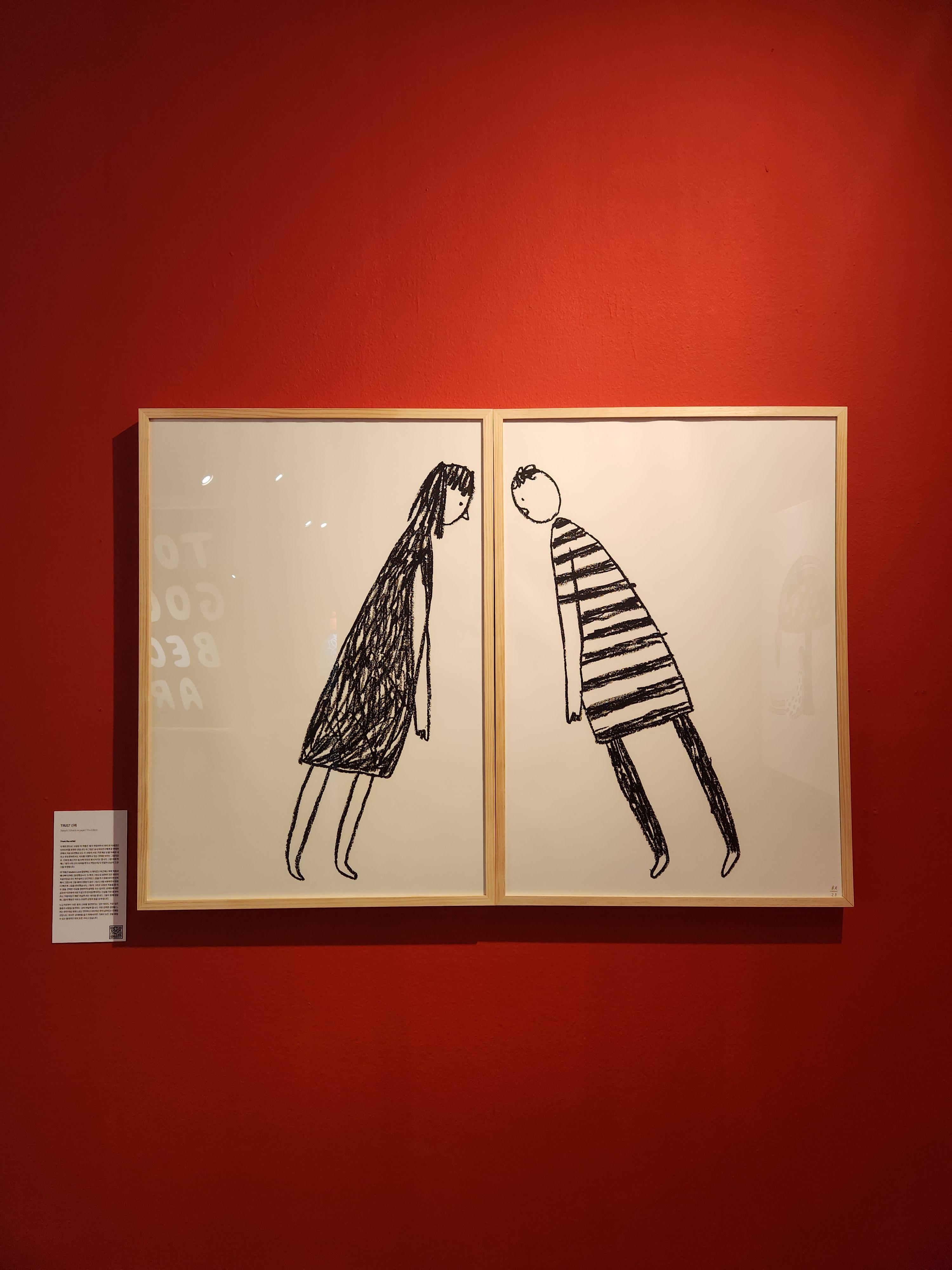 아래 작품은 브라이언 레의 작품 중에 trust라는 작품인데 큐레이터분의 설명으로 작가가 여자친구에게 연애편지에 그려주던 그림이라고 해요. 서로 기대어야 믿음이 생길 수 있다고 생각하는 작가의 동양적인 사상이 드러난 작품이라고해요.