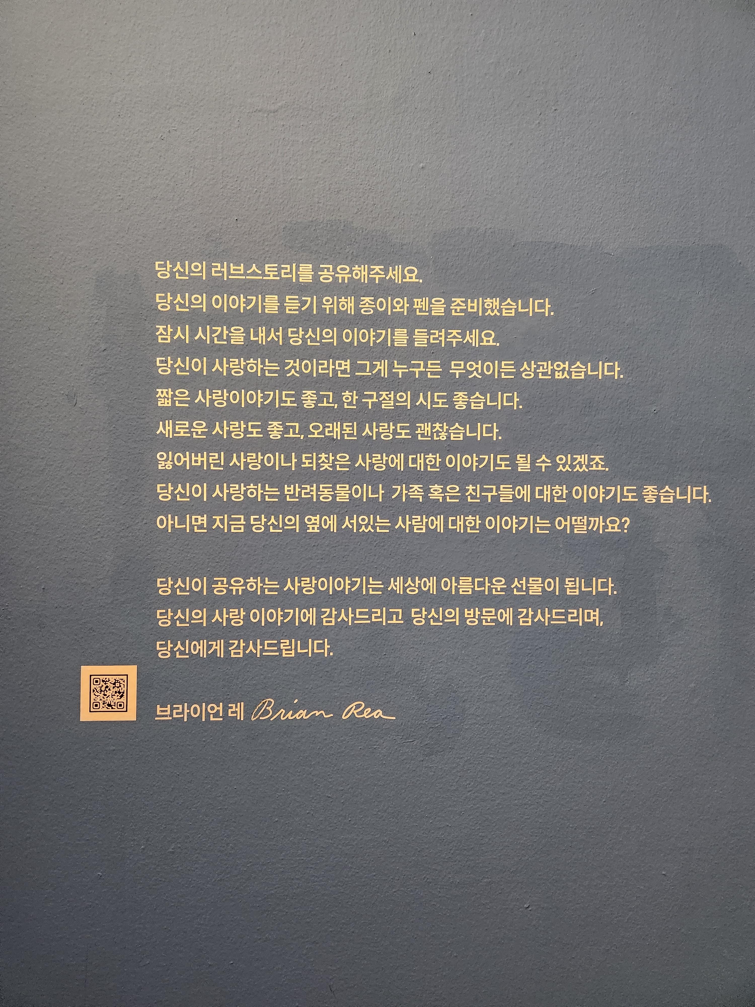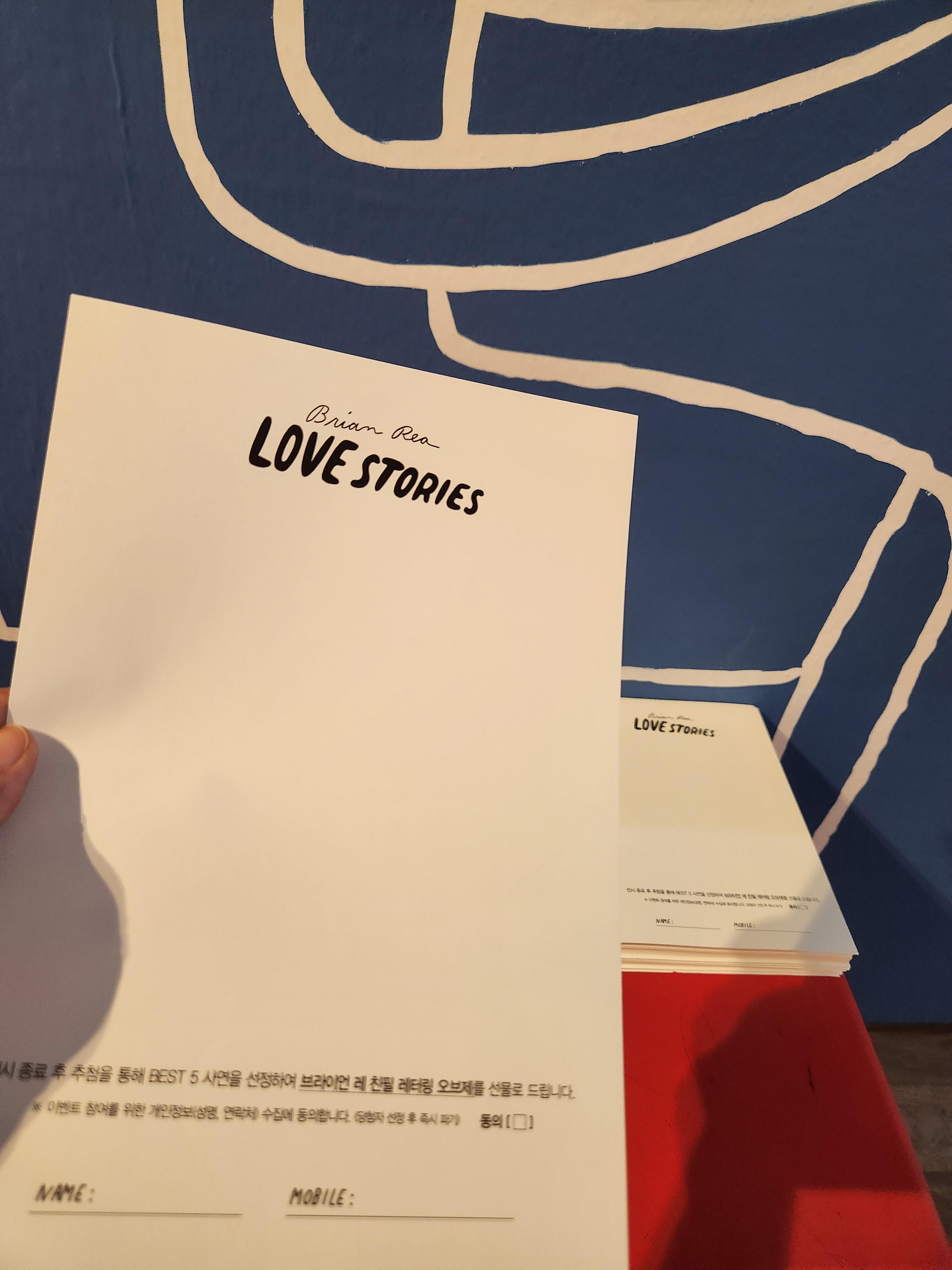 전시가 끝날즈음~ 나만의 러브스토리를 공유해보는 공간이 있었답니다. 나의 사랑이야기를 공유하면 브라이언레의 친필 사인이 들어있는 선물을 받을 수 있는 기회!!!가 생겨요. 물론 당첨이 되면요. 5명!!! 나의 사랑이야기도 간단하게 남겨보고!!!