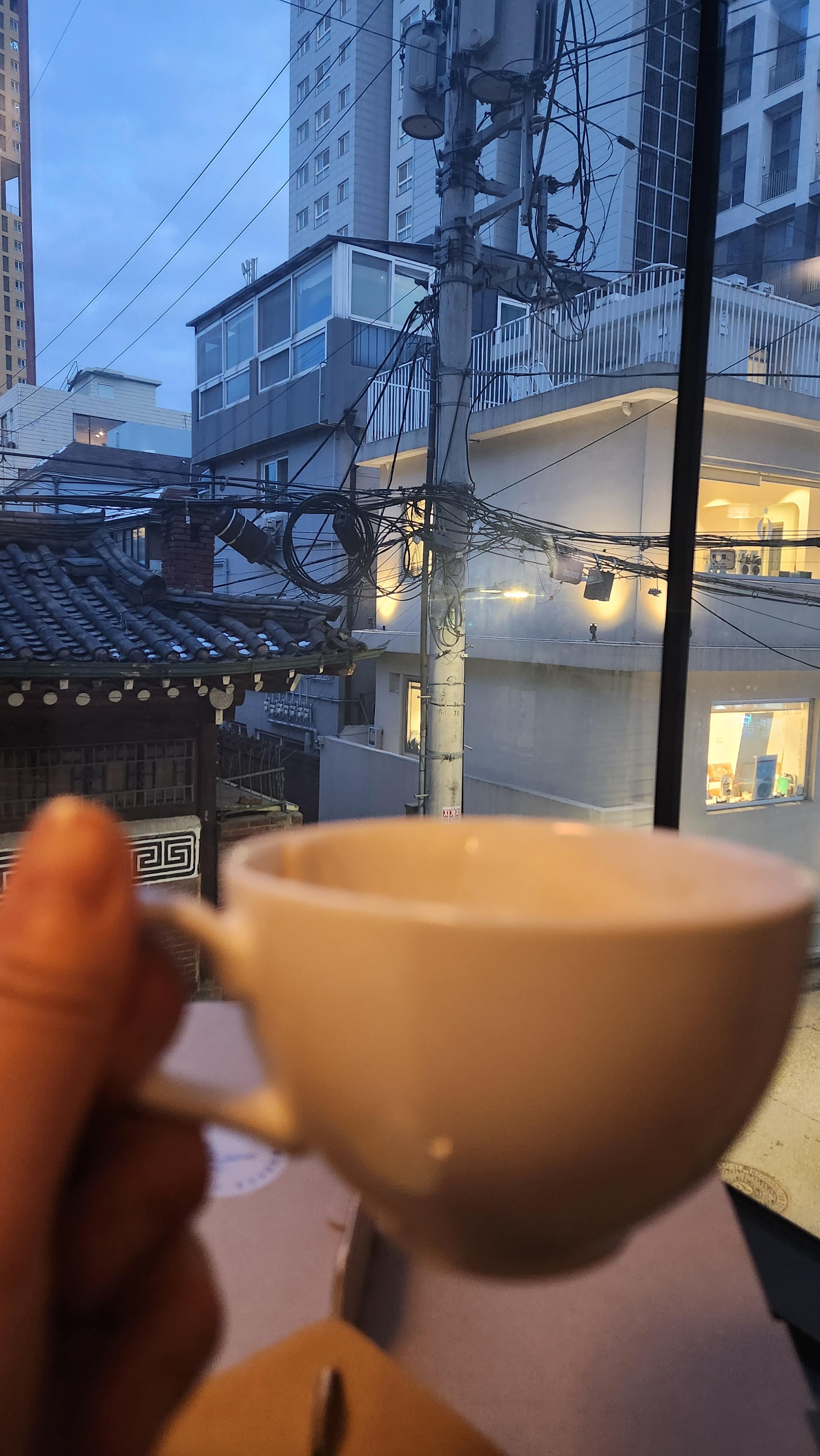 주변 특징을 들자면 저 한옥 건물이 보인다는 것, 그리고 한옥 건물 맞은편 흰건물 유리도어를 지나면 안쪽 엘리베이터가 있었다. 엘리베이터를 타고 2층으로 가면 작은 식캣사인이 나온다. 시즌 메뉴로 나왔던 무화과 이튼메스를 넘 먹고싶어서 내내 남편을 졸라 방문했던... 그러고 한참 지나 남편과 방문했을 땐 고구마 크림 브뤨레와 시즌메뉴로 나왔던 감귤소르베, 그리고 내가 좋아하는 짜이를 주문했다.