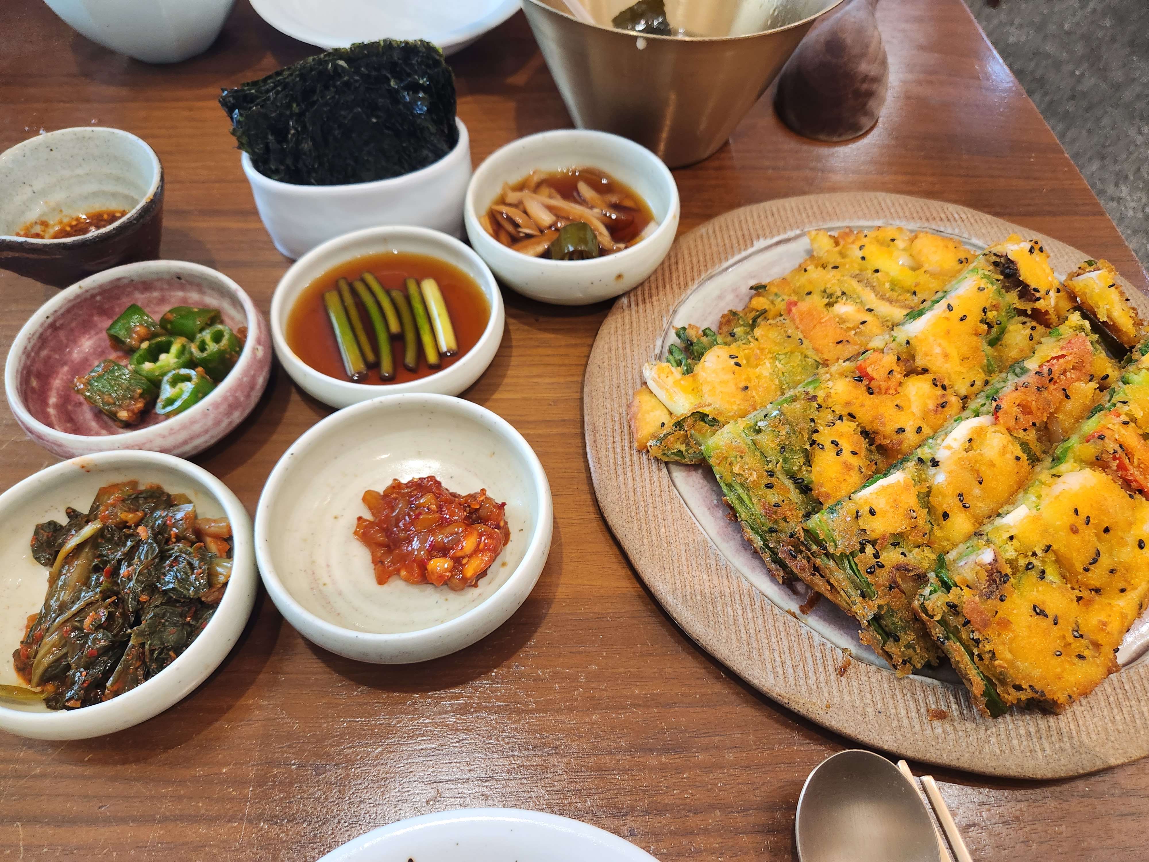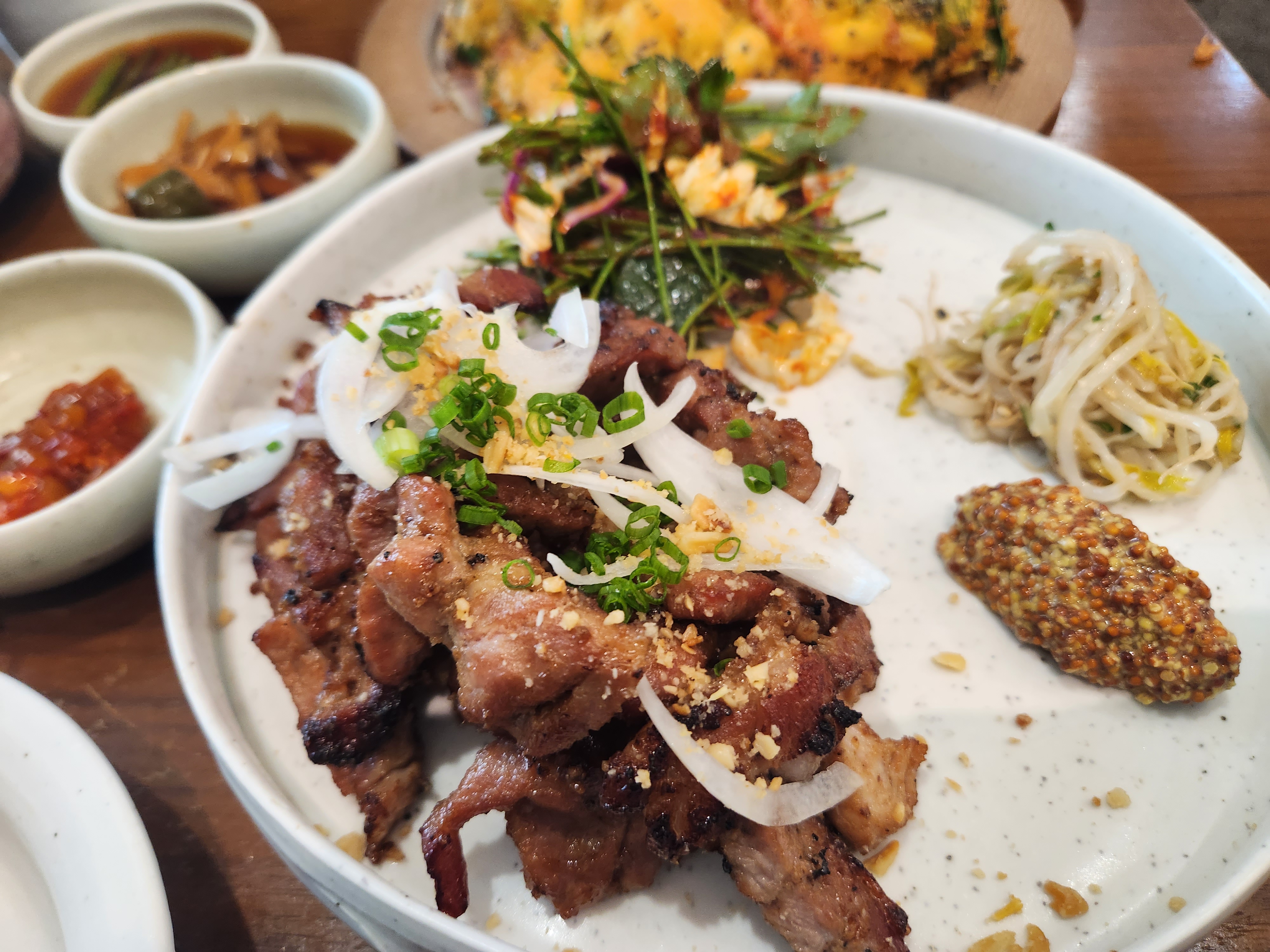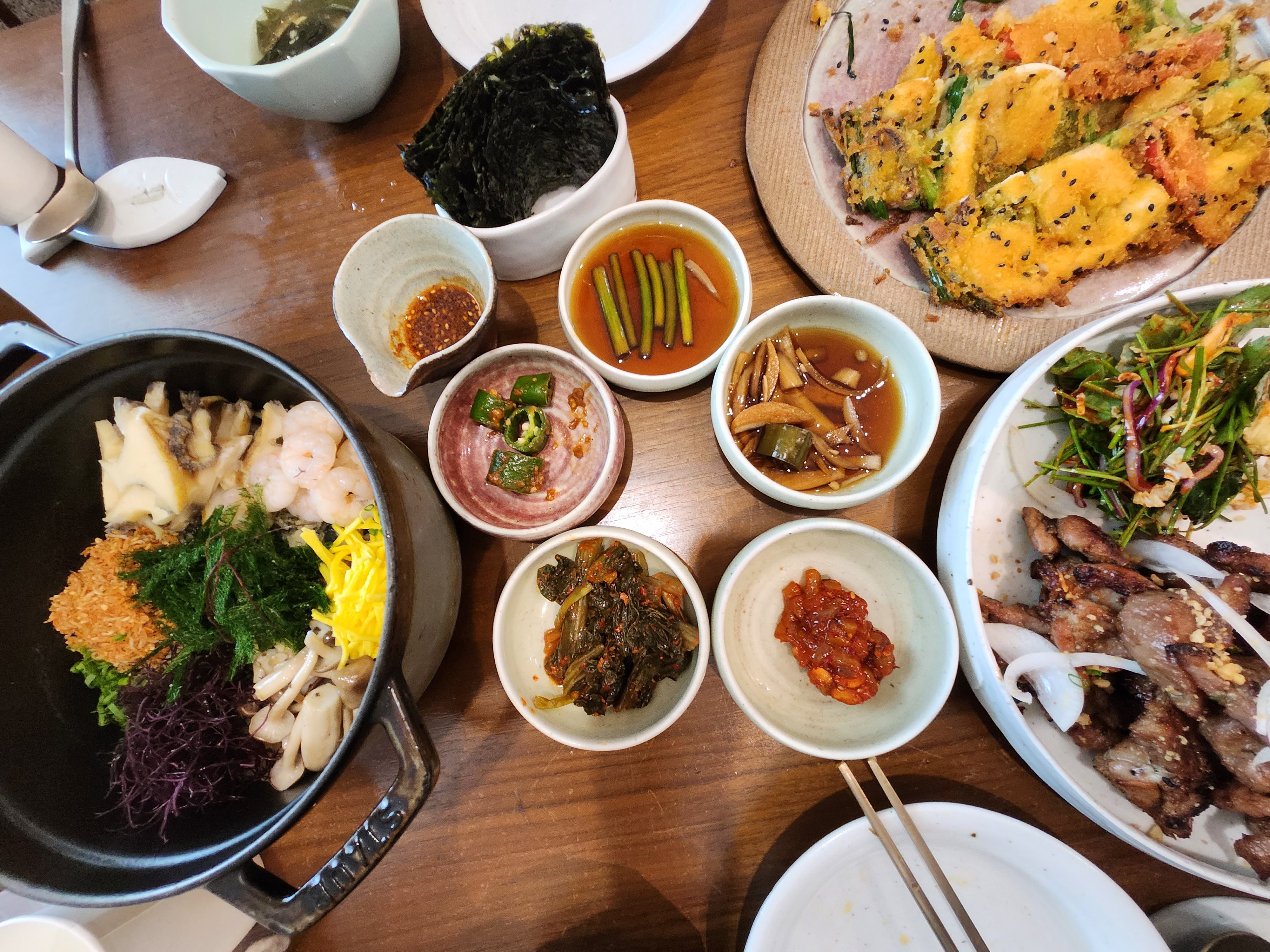 남해 힙한 한정식집 / 전복솥밥과 바삭한 해물파전 그리고 숯불양념목살구이와 향채무침