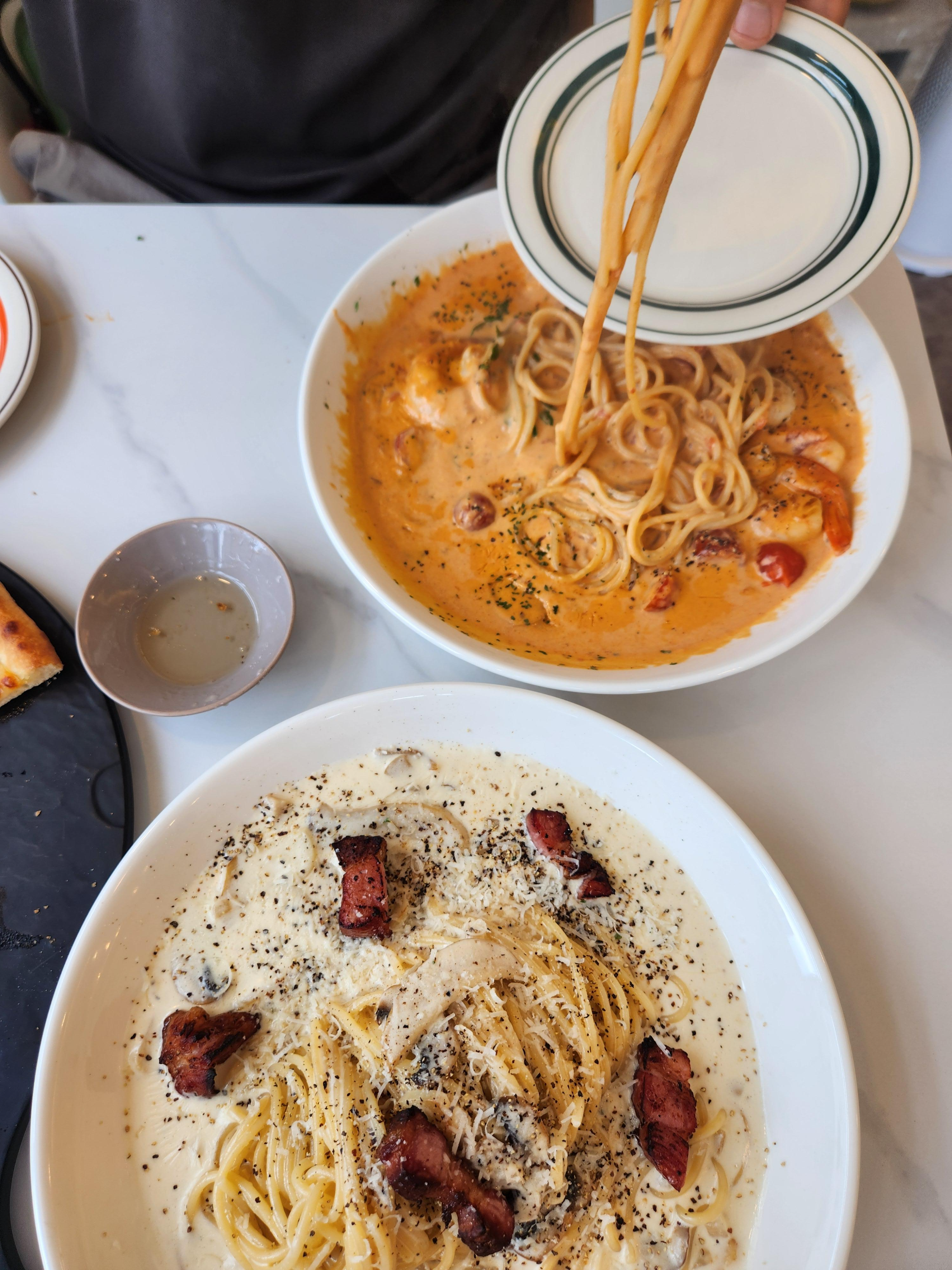 피자에 뒤이어 왼쪽 쉬림프 로제 파스타와 오른쪽 스모크 베이컨 크림 파스타가 나왔다.