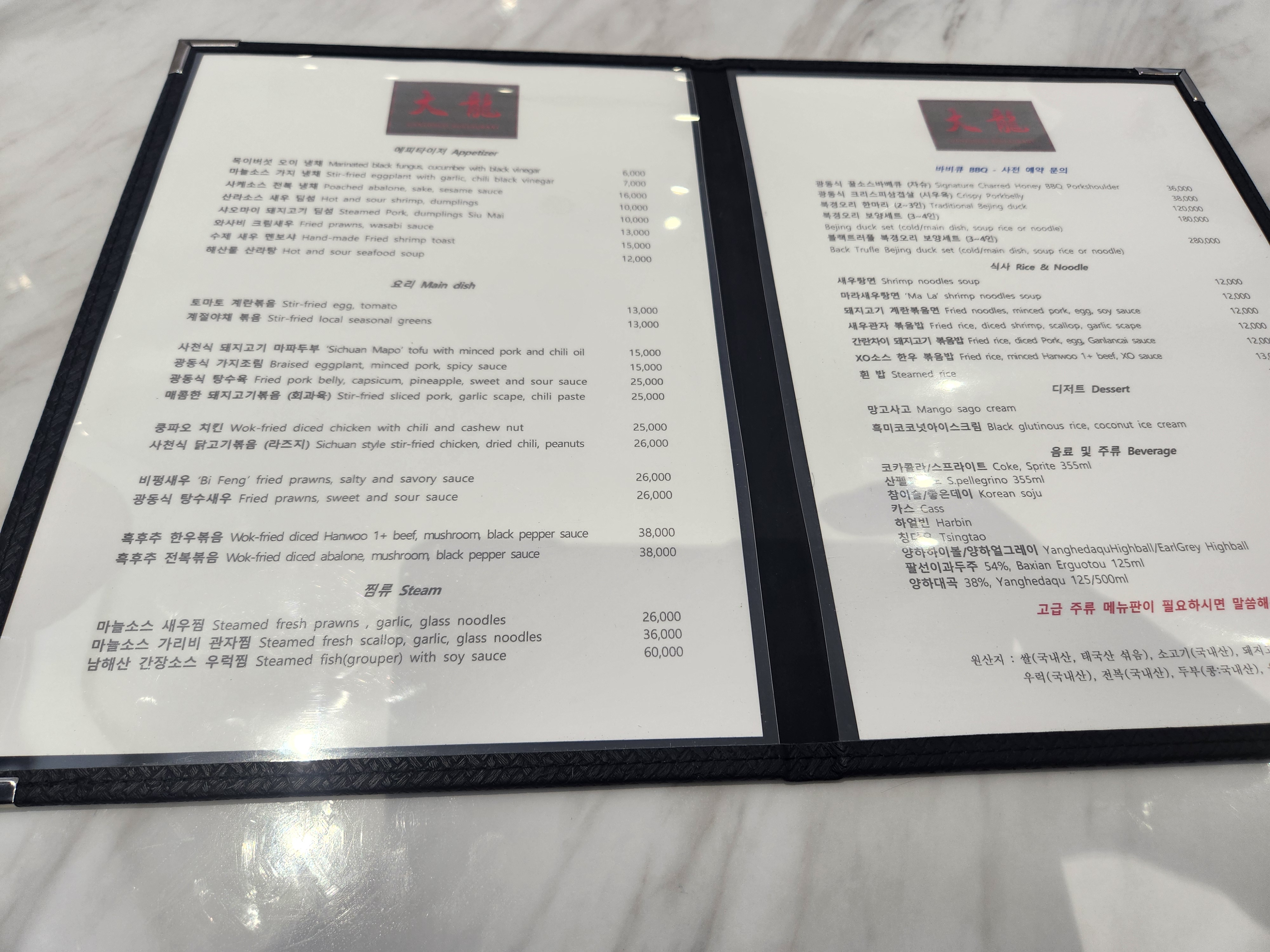 매장에 들어서니 매장이 아주 깔끔하고 매장 이름처럼 큰 용 한마리가 눈에 쏘옥 들어왔다. 미리예약한 베이징 덕 외에 다른 메뉴도 궁금해서 주문하고 마라새우탕면과 광동식 탕수육, 마늘소스가리비찜 추가!