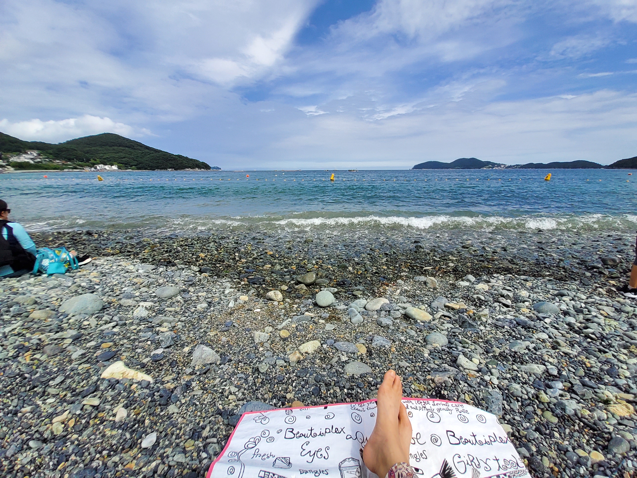 아쉬움이 남긴 했지만... 가져간 돗자리를 펼쳐두고 밀물 썰물에 촤르르 거리는 파도소리를 들으니 이 마저도 사르르 마음이 녹아지네요. 언젠가 다시와도 이 모습 그대로 아니 더 많은 돌들이 예쁘게 자리하고 있으면 좋겠다는 생각이 들었네요. 그래도 시원하게 비치는 바다뷰~~ 찐이구요.